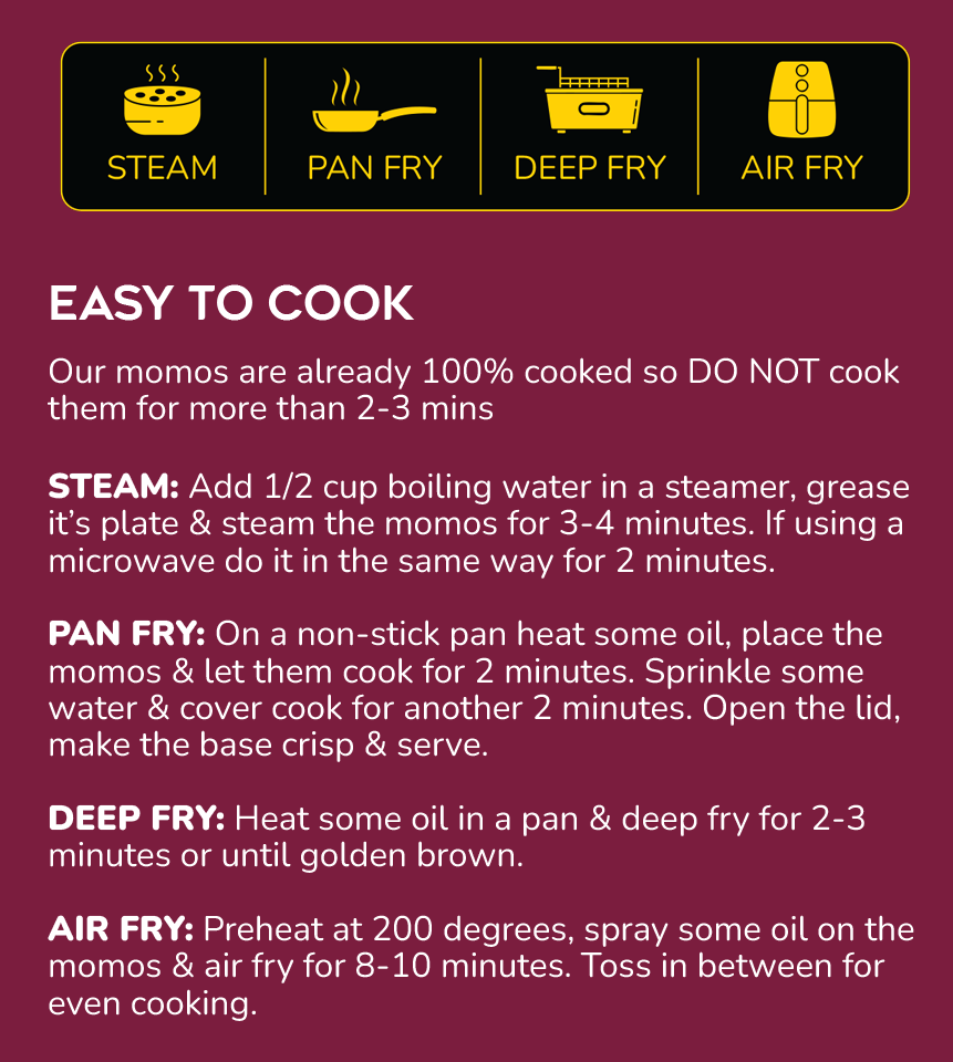 Spend time where it actually matters - at the dinner table and not in the kitchen! Our momos are already 100% cooked, so DO NOT cook them for more than 2-3 mins
